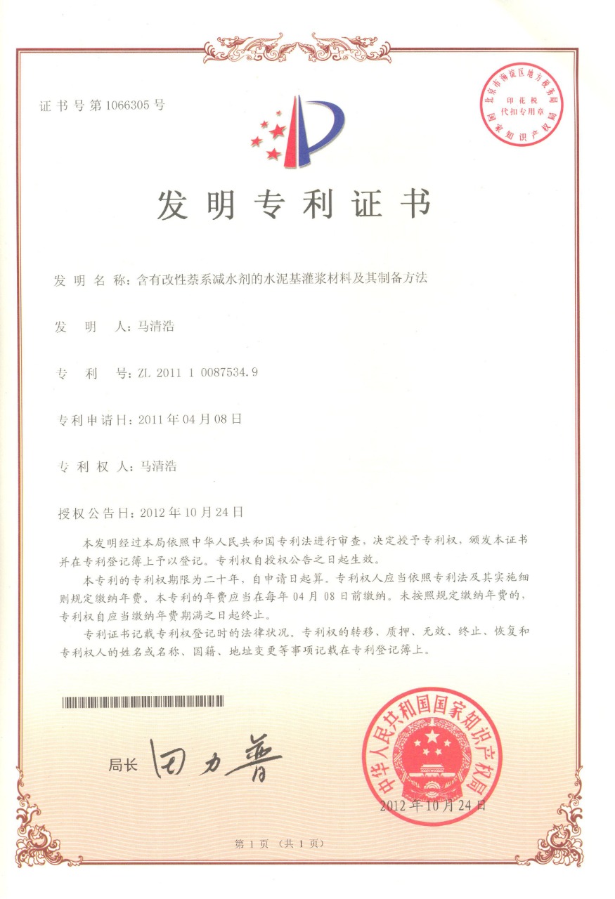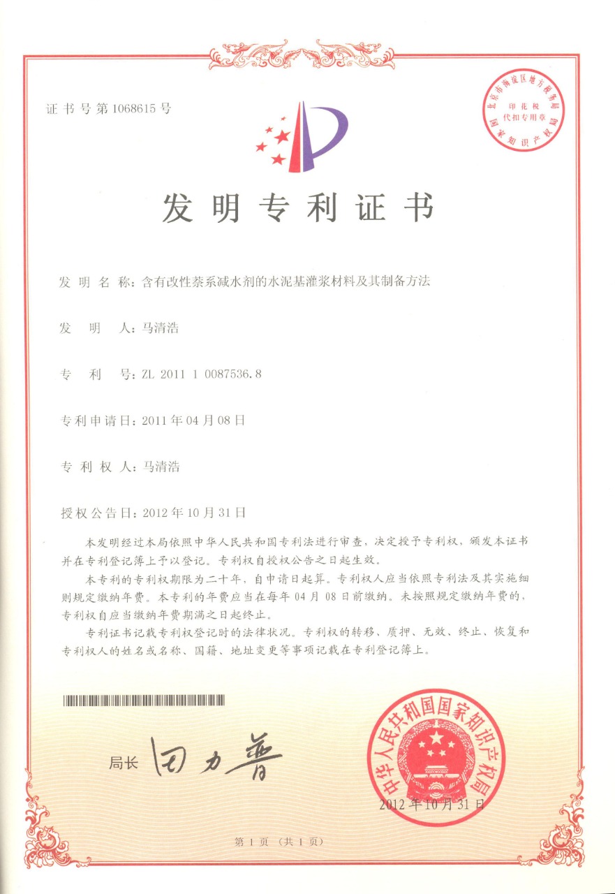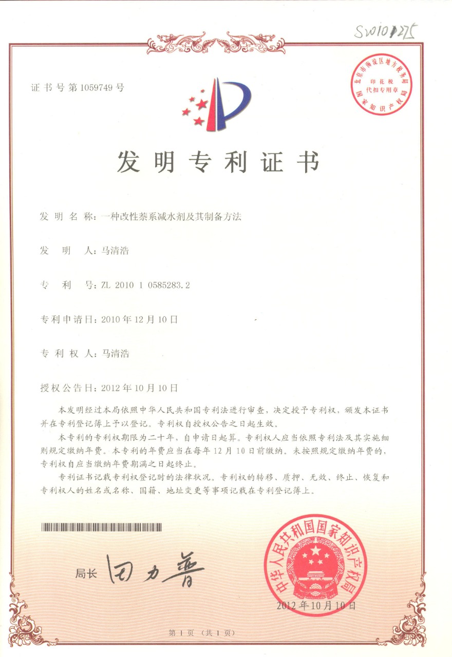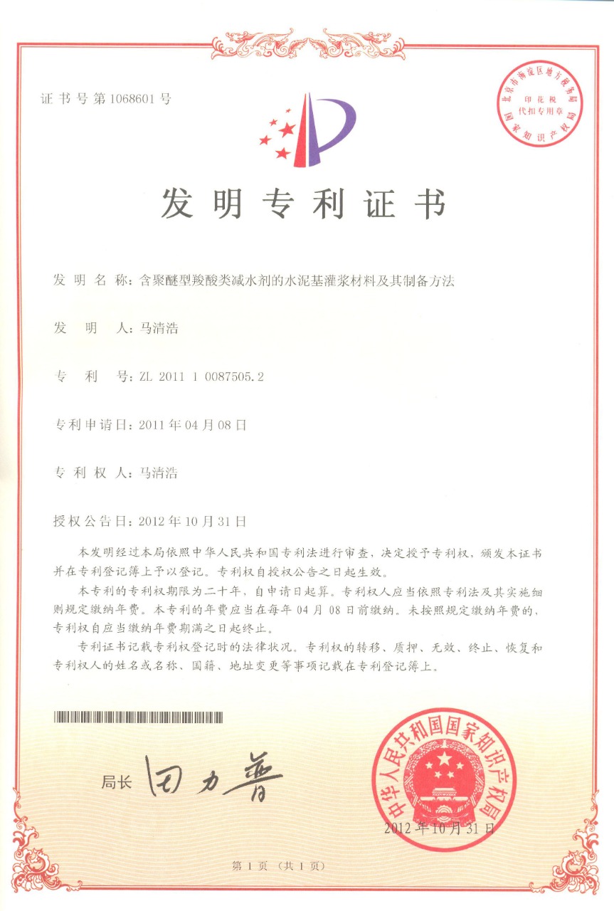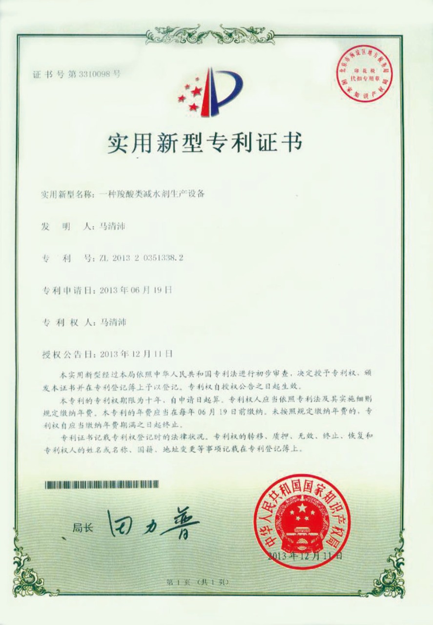 The patented product technology of polycarboxylate superplasticizer in 2003