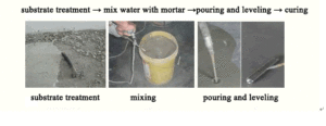 Whether pouring from a mixing vessel or using a mechanical mixer with an application hose, the discharge point should be approximately 200mm from the floor to prevent splashing and air entrapment.